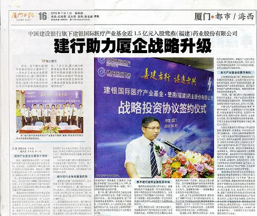 鷺燕(福建)藥業股份有限公司與建銀國際醫療產業股權投資有限公司于2010年6月30日在廈門簽署戰略投資協議。