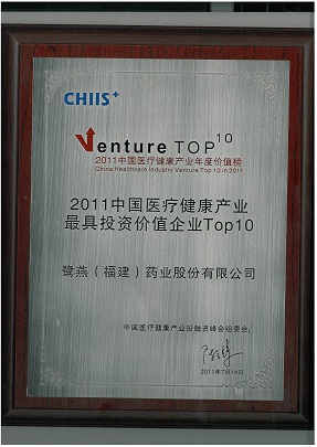 2011年7月14日,在北京舉辦的2011第五屆中國(guó)醫(yī)療健康產(chǎn)業(yè)投融資峰會(huì)上,鷺燕(福建)藥業(yè)股份有限公司榮獲“2011中國(guó)醫(yī)療健康產(chǎn)業(yè)最具投資價(jià)值企業(yè)TOP10”稱(chēng)號(hào)。公司于2010年引進(jìn)建銀國(guó)際醫(yī)療產(chǎn)業(yè)基金等投資者近1.5億元投資后,在公司治理、經(jīng)營(yíng)業(yè)績(jī)、戰(zhàn)略布局等方面得到進(jìn)一步提升,鞏固了公司在福建省醫(yī)藥流通領(lǐng)域的龍頭地位。